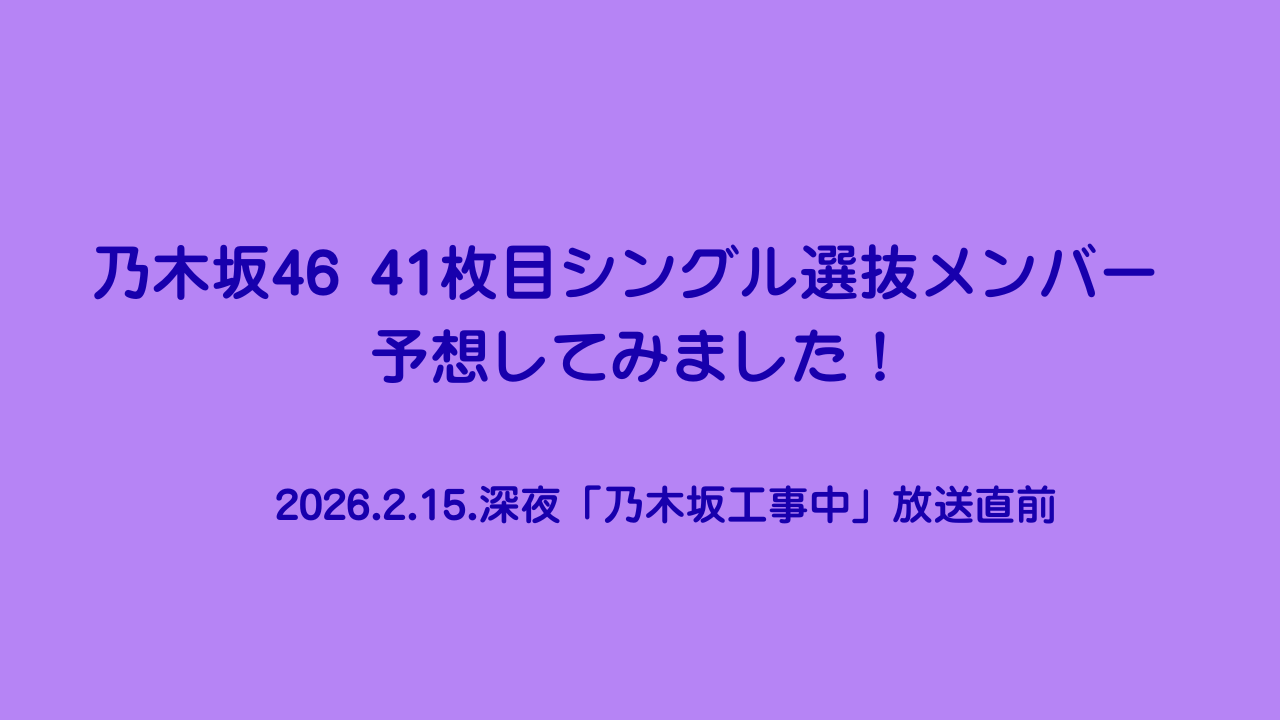 さて、2月8日深夜放送の乃木坂工事中にて、41枚目シングル選抜メンバーが発表されると告知がありました。毎シングルで、自分なりの予想を立ててきましたので、今回もちゃんと予想した上で乃木坂工事中を見ようと思います。
