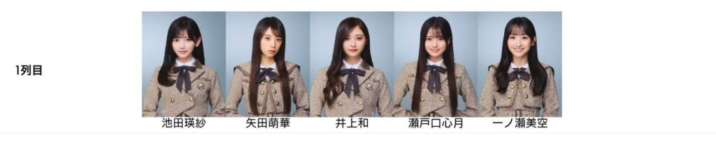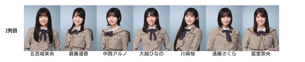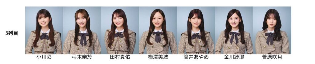 センターはなぎちゃん、5期6期で1列目をいく布陣でいってほしい!ということで、前回のWセンター2人を5期ではさみました。40枚目シングルでは、6期2人が4期かきさくにはさまれたフォーメーションでしたが、今回は5・6期フェイスで印象づけれたらいいな、という私の願いです。